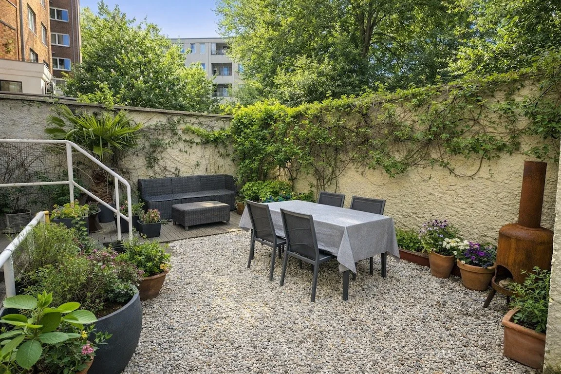 Le niveau principal propose un espace de vie lumineux avec cuisine semi-ouverte, salle à manger, une chambre et une salle de bains, avec accès direct à une cour privative.